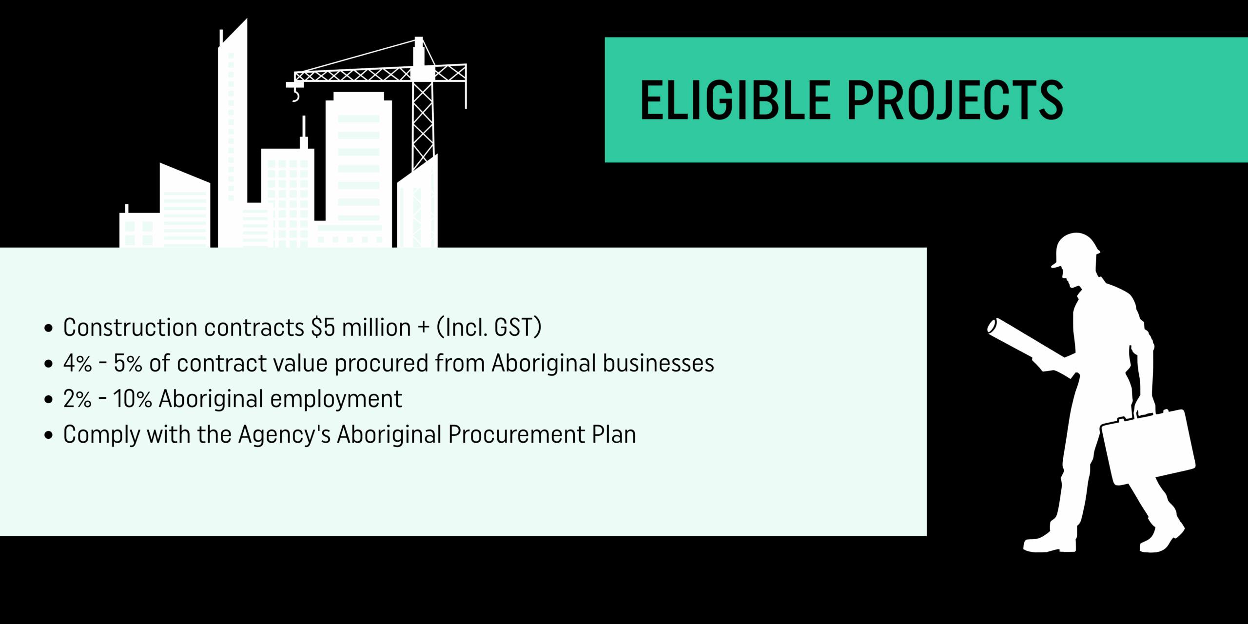 The Aboriginal Procurement Policy applies to WA Government agencies that are required to meet the targets set out in the policy. Construction contracts that are $5 million or higher are eligible.