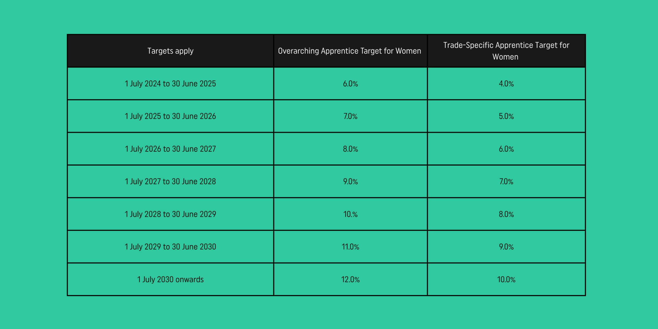 - 2026–27 financial year = 8% Women Apprentices and 6% Women Trade Apprentices